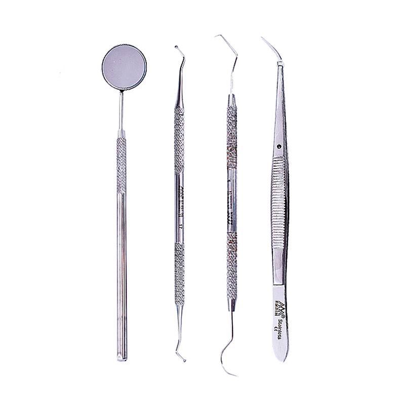 El conjunto básico utilizado en odontología para llevar a cabo exámenes, procedimientos y limpiezas.