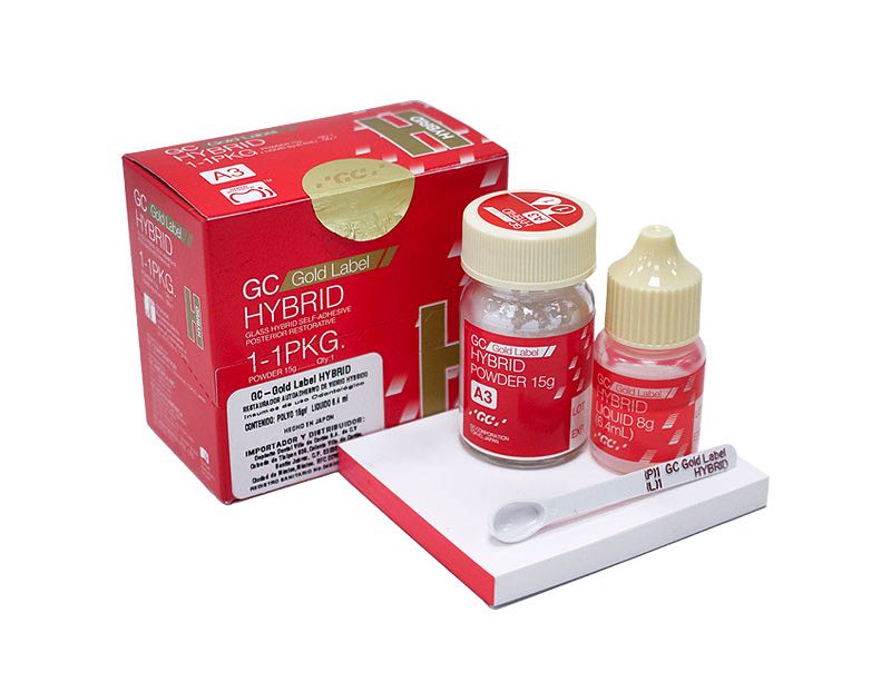 • Gold Label Hybrid consiste en un vidrio FAS más resistente a los ácidos y un ácido poliacrílico de mayor peso molecular. Estos dos componentes fortalecen la matriz restauradora y otorgan una mayor resistencia a los ácidos de la cavidad oral.