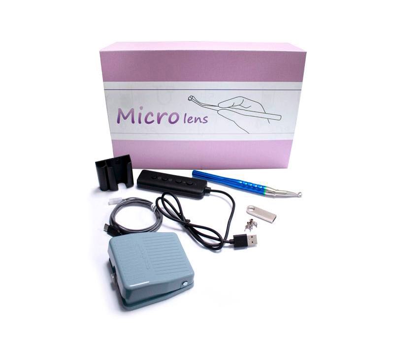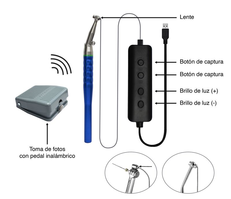 Camara intraoral con sistema de captura de imagen por lente micro. Se conecta mediante USB al ordenador o unidad principal y permite realizar capturas fotográficas a través de un botón en el mango o mediante un pedal inalámbrico.