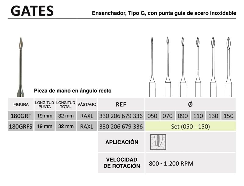 Fresas Gates-Glidden (también llamada “Gates”) utilizada principalmente en endodoncia para expandir la entrada de los conductos radiculares, troquelar la pared coronaria y mejorar el acceso, eliminar obstrucciones coronales antes de instrumentar el resto del conducto, facilitar la recta de inserción de limas manuales y rotatorias.