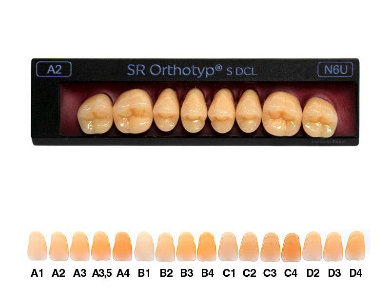 Oclusión clásica:Los dientes SR Orthotyp S DCL son la opción clásica para su uso en prótesis dentales completas, parciales híbridas y sobre implantes. Los dientes Orthotyp se seleccionan en una situación de mordida normal en una relación de uno a dos dientes. De este modo, los contactos primarios en posición céntrica se encuentran en la fosa central de la mandíbula, así como en las crestas marginales.