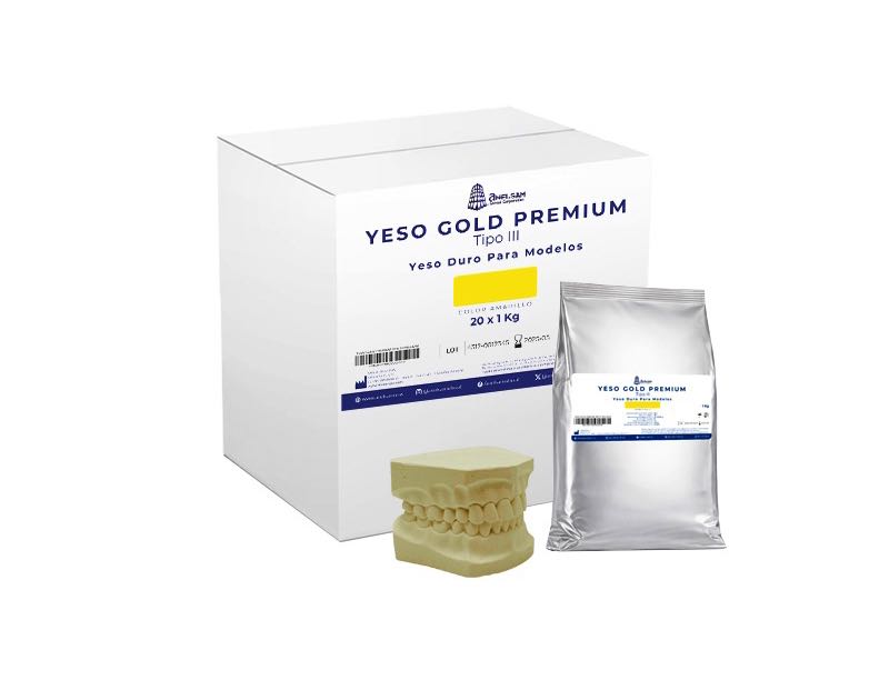 YESO GOLD PREMIUM TIPO III ANELSAM Yeso duro natural tipo III. Para prótesis removibles totales o parciales y modelos antagonistas. | CARACTERÍSTICAS Dotado de una fluidez óptima, su consistencia garantiza la fiel reproducción de los detalles de la impresión.Es compatible con todos los materiales de impresión.Conforme norma I.S.O. 6873. | INDICACIONES Modelos para prótesis removibles totales o parciales.Modelos antagonistas. | PROPIEDADES Proporción de mezclado: 30 ml/ 100 gMezcla bajo vacío: 30 segundosTiempo de mezcla manual: 1 minutoTiempo de trabajo: 8 minutosTiempo de fraguado (Vcat): 10 minutosExpansión de fraguado (2h): 0.15%Resistencia a la compresión (1h): 34 MPaTiempo de extracción: 45 minutosColor: Amarillo | PRESENTACIÓN Bolsa de 1 kg o Caja c/20 kg | MARCA ANELSAM | PAÍS DE ORIGEN España