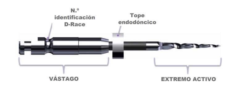 conductos radiculares. Las dos limas de NiTi D-Race se utilizan para eliminar la mayor parte del material de obturación radicular antiguo, como guta percha, obturadores o materiales a base de resina, del interior de los conductos.