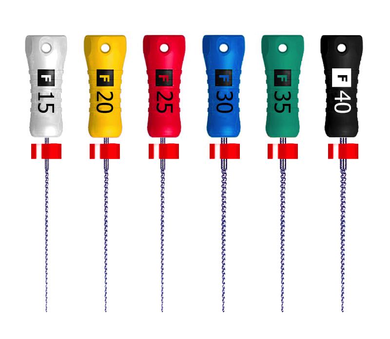 Las limas K-Flex son más flexibles que las limas “K” convencionales, principalmente en los tamaños nº 30 y superiores, lo cual facilita el tratamiento de canales curvos y su preparación con mínimas posibilidades de formación de escalones o perforaciones.