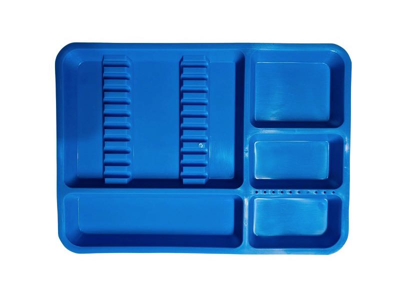 • Su diseño incorpora divisiones y canales acanalados, que permiten colocar instrumentos de manera ordenada y segura, evitando que se deslicen o se mezclen durante el trabajo clínico.