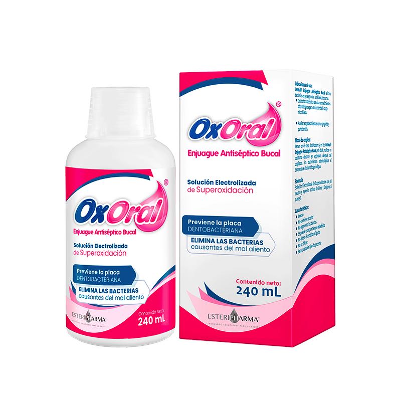 • OxOral® Enjuague Antiséptico Bucal contiene como ingrediente activo especies activas de cloro y oxígeno, así como elevado potencial REDOX (ORP). Inactiva virus al contacto por ruptura de enlaces y desnaturalización de componentes estructurales de envolturas y cápsides, evitando su entrada a la célula huésped, previniendo la infección. En contacto con bacterias, hongos y esporas, induce daño oxidante al depredar electrones de sus estructuras externas, causando ruptura de enlaces químicos, extravasado del contenido intracelular y lisis osmótica, desencadenando desequilibrio en los procesos vitales del microorganismo y su inactivación. Adicionalmente, el daño ocasionado sobre la superficie del patógeno puede permitir la entrada de las especies activas de cloro y oxígeno, que oxidan estructuras y sustratos internos, coadyuvando su eliminación.