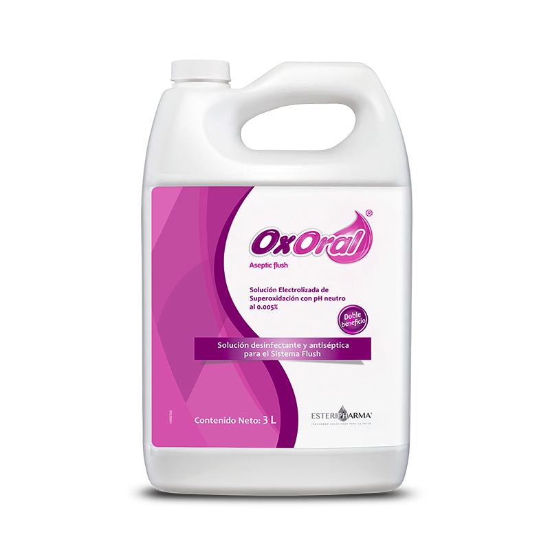 Solución Electrolizada de Superoxidación con pH neutro y especies activas de Cloro y Oxígeno al 0.005%. Elimina virus, bacterias y hongos, la cual no emite vapores y es inocua. Idea para desinfección de alto nivel del sistema flush de la unidad dental y antisepsia del paciente.